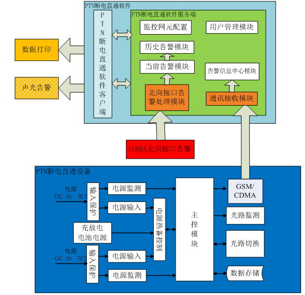 1、PTN断电直通软硬件采用分布式部署设计,PTN断电直通软件通过北向接口以及告警通讯通道与PTN断电直通设备进行交互,双通道告警保证可靠的反应现场PTN网元设备的工作状态。